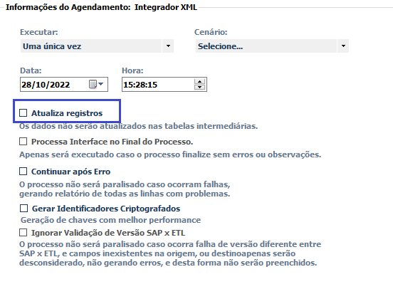 Implementada a funcionalidade de atualização de registros para o Integrador de XML. Para utilizar a funcionalidade, basta marcar a opção ao criar a tarefa da Tela de Extração de Dados.