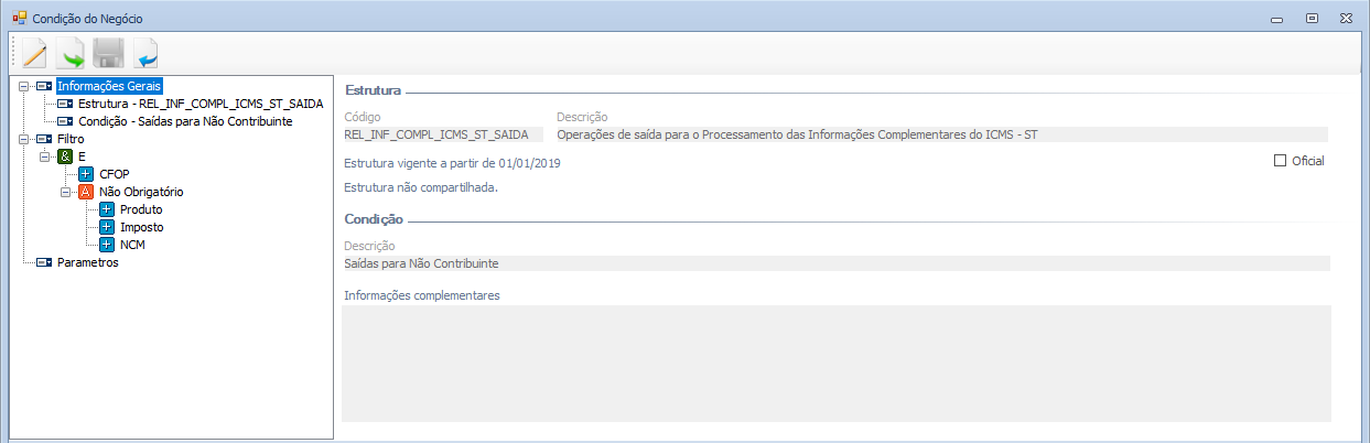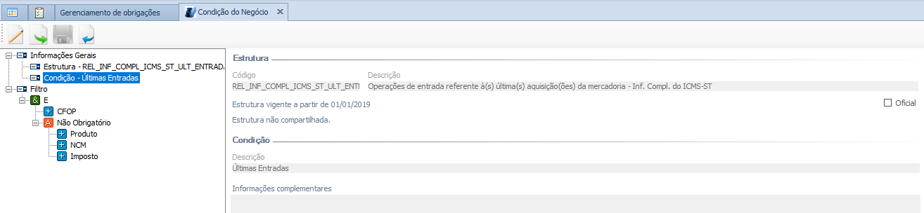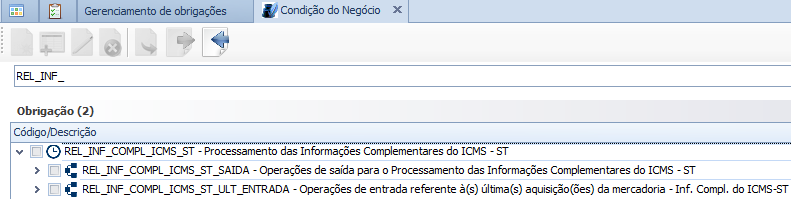 Foi disponibilizada a obrigação REL_INF_COMPL_ICMS_ST e a estrutura das condições de negócio: REL_INF_COMPL_ICMS_ST_SAIDAS e REL_INF_COMPL_ICMS_ST_ULT_ENTRADA, conforme demonstrado abaixo: