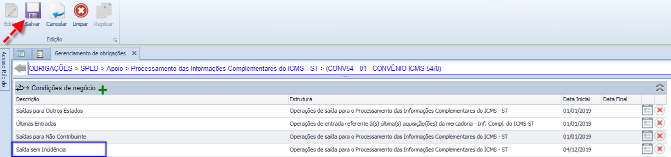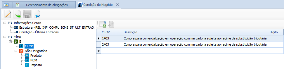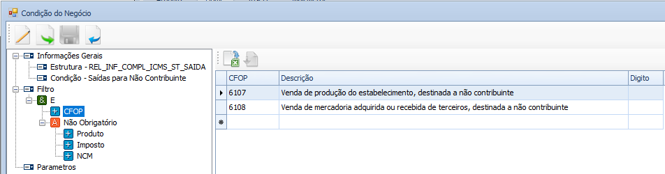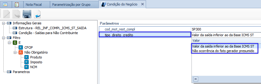 Configuração do parâmetro tipo_direito_credito da condição de negócio REL_INF_COMPL_ICMS_ST_SAIDAS