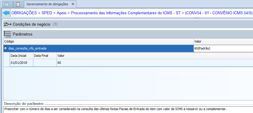 Este parâmetro deve ser preenchido com o número de dias a ser considerado na consulta das últimas Notas Fiscais de Entrada do item com valor de ICMS a ressarcir ou a complementar.