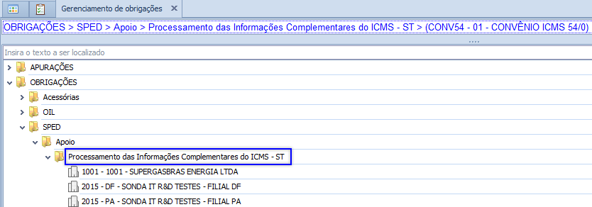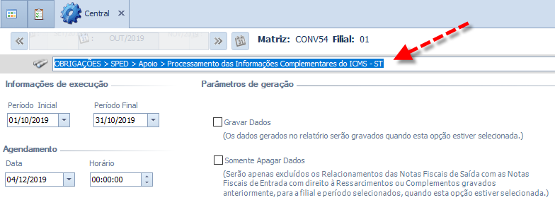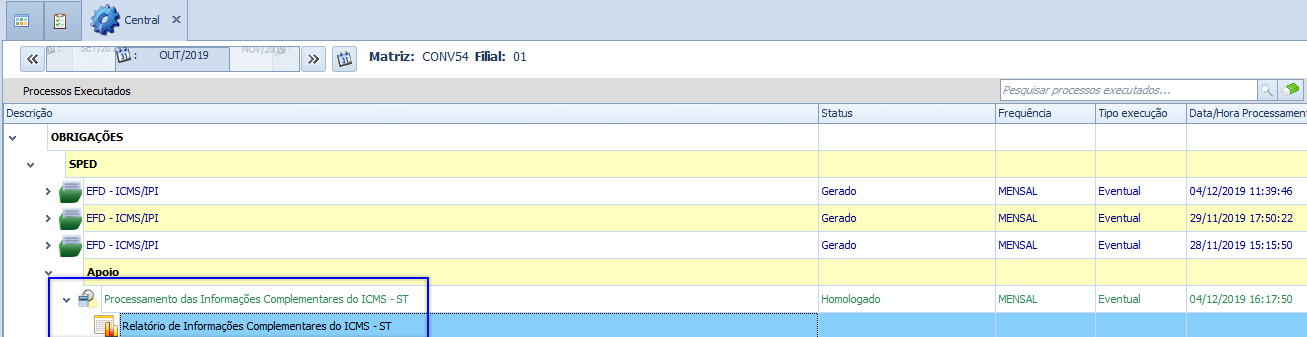 O Relatório de Informações Complementares do ICMS ST foi disponibilizado na Central. Para executá-lo, seguir a hierarquia: OBRIGAÇÕES -> SPED -> Apoio -> Processamento das Informações Complementares do ICMS ST.