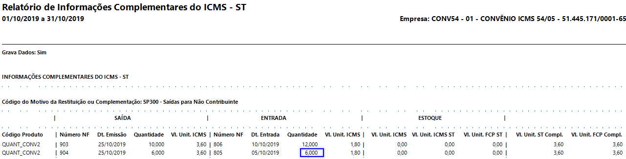 Se o parâmetro tipo_direito_credito da condição de negócio REL_INF_COMPL_ICMS_ST_SAIDAS estiver configurado com “Valor da saída inferior ao da Base ICMS ST”, será considerada a coluna “Vl. Unit. ICMS – Estoque” + “Vl. Unit. ICMS ST – Estoque” – Vl. Unit. ICMS – Saída”.