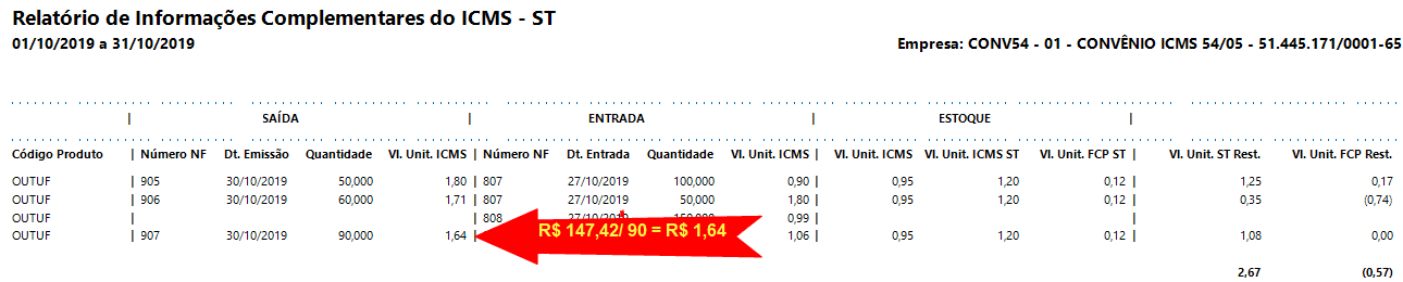 Vl. Unit. ST Compl.: Coluna “Vl. Unit. ICMS – Saída” – “Vl. Unit. ICMS – Estoque” – “Vl. Unit. ICMS ST – Estoque”.