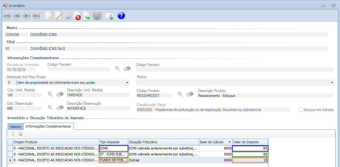 Para apresentação das colunas "Vl. Unit. ICMS", "Vl. Unit. ICMS ST" e "Vl. Unit. FCP ST" será efetuada a divisão respectivamente dos impostos 01 (ICMS), 03 (ICMS ST) + 83 (FCP ST) e 83 (FCP ST) da aba "Informações Complementares" da tela "Inventário" pela quantidade do item do Inventário.