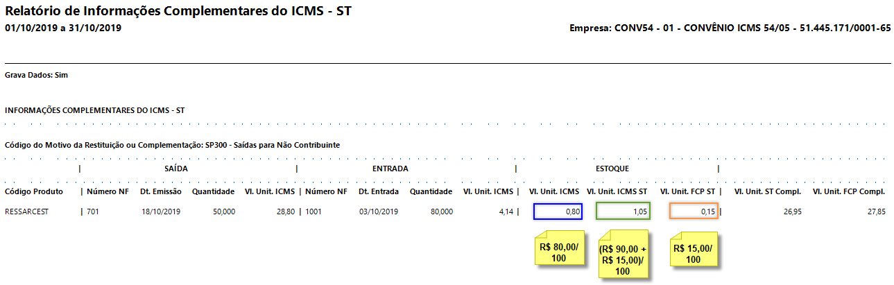 Vl. Unit. FCP Rest.: se o parâmetro tipo_direito_credito da condição de negócio REL_INF_COMPL_ICMS_ST_SAIDAS estiver configurado com “Não ocorrência do fato gerador presumido”, será considerada a coluna “Vl. Unit. ICMS – Estoque” + “Vl. Unit. FCP ST – Estoque” – “Vl. Unit. ICMS – Entrada”.