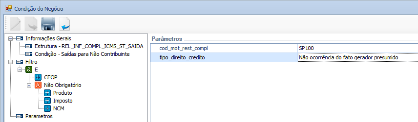Esta condição de negócio deve ser criada com os filtros específicos para cada motivo da restituição ou complementação do ICMS ST.