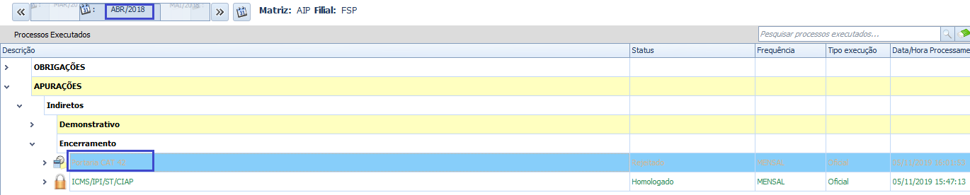 No exemplo abaixo foi selecionado o mês de 04/2018 erroneamente, pois o próximo período a encerrar seria o mês 03/2018: