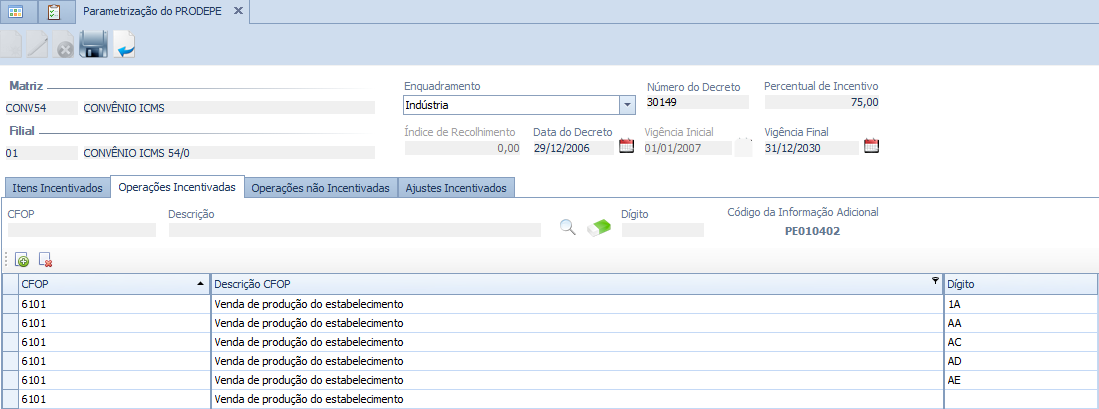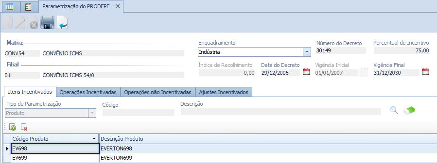Observe que tanto o produto EV698 quanto o CFOP e Dígito 6101 AA estão configurados como Incentivados na tela "Parametrização do PRODEPE". Porém, foi apresentado indevidamente no campo 02 (COD_INF_ITEM) do registro C177, o código PE000100 (Operação com item não incentivado: sub apuração 01).