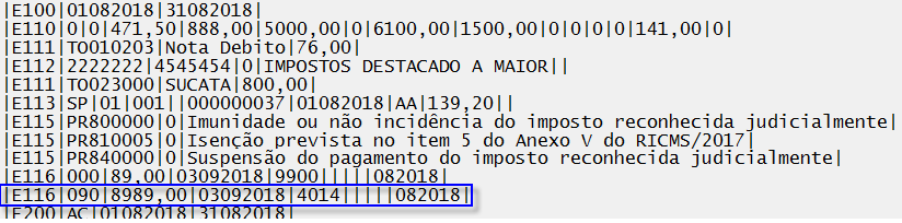 Descrição da Nota: Tratamento realizado nos registros: E111, E116, E220, E250, E311, E316 e E530 para retirar os códigos de impostos que estavam fixos no filtro de geração das informações para classificar os ajustes e guias em seu respectivo registro. Tratada também a geração do campo 02 (COD_INF_ADIC) do registro E115 para que não seja gerado em branco quando o campo "Código de Benefício Fiscal" da Nota Fiscal estiver preenchido com espaço.