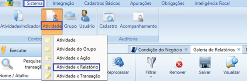 Para liberação do relatório na Galeria, acessar o menu: Sistema > Atividade > Atividade X Relatório.