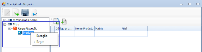 O filtro “Produto” poderá ser utilizado como regra ou exceção, tendo como padrão a utilização como “Regra”:
