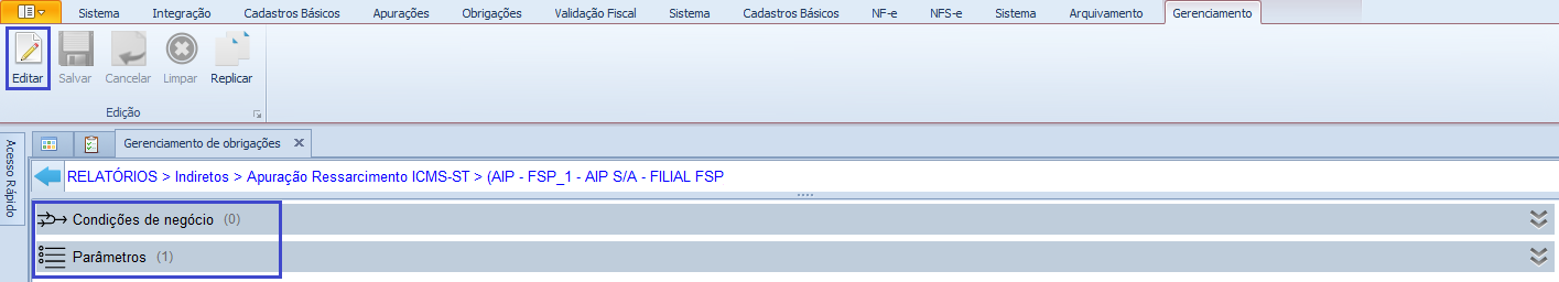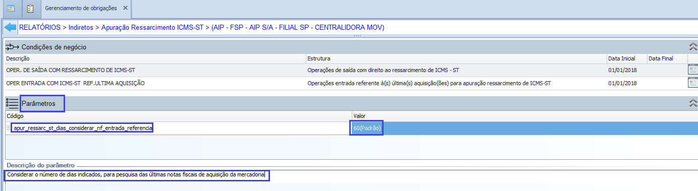 Para apurar o ressarcimento de ST será necessário configurar condições de negócio e definir parâmetro para a obrigação APUR_RESSARC_ST - Apuração Ressarcimento ICMS-ST.