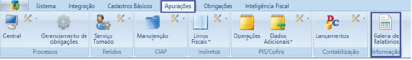 Integração, Cadastros Básicos, Apurações, Obrigações ou Inteligência Fiscal.