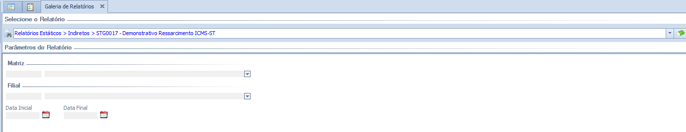 Selecionar o relatório STG0017 - Demonstrativo Ressarcimento ICMS-ST em: Relatórios Estáticos > Indiretos.
