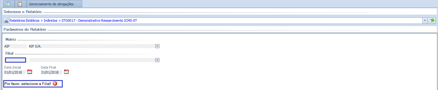 O relatório poderá ser gerado apenas por Filial. Será apresentada a seguinte mensagem se não houver informação da Filial: " Por favor, selecione a Filial".