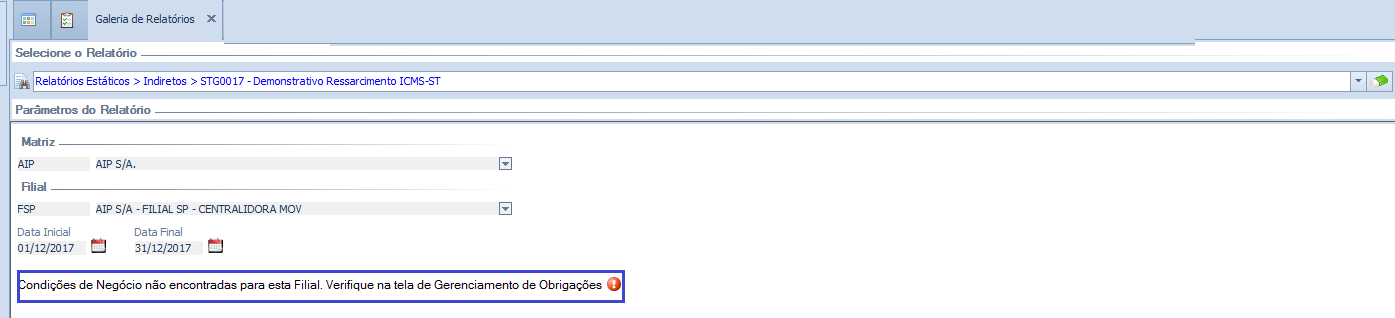 "Condições de Negócio não encontradas para esta Filial. Verifique na tela de Geranciamento de Obrigações".