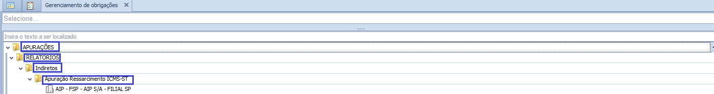 Clicar em Apurações > Gerenciamento de Obrigações e selecionar: Apurações > Relatórios > Indiretos > Apuração Ressarcimento ICMS-ST e clicar na filial desejada.