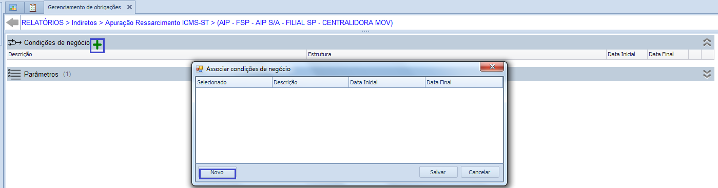 Clicar no sinal de + da linha de condição de negócio e após, clicar em “novo”.