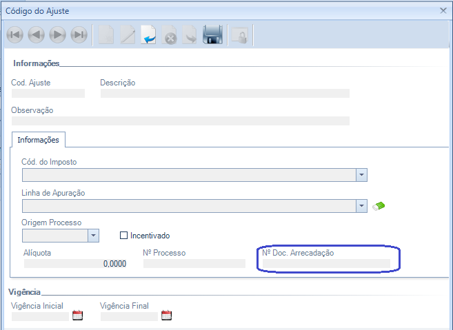 Para associação da Guia com o Código do Ajuste, foi incluído o campo N. Doc. Arrecadação na tela Código do Ajuste.