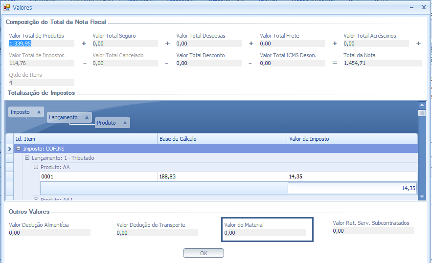 Descrição da Nota: Apresentação do campo Valor do Material na sub-tela de Valores, parte Outros Valores, da tela de Notas Fiscais.