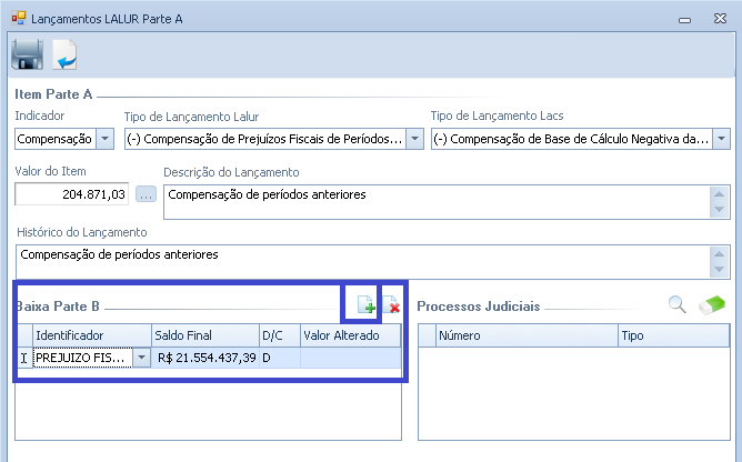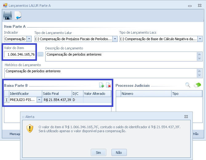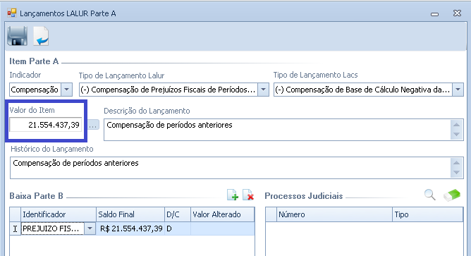 Para o exemplo acima, será compensado 30% do Lucro antes das Compensações. O identificador da parte B, possui saldo remanescente (a ser compensado em períodos futuros). O o sistema preenche automaticamente com 30% do lucro apurado (Antes das compensações), contudo o usuário também pode indicar o valor desejado no campo "Valor do Item", desde que não ultrapasse o valor do identificador da parte B ou o limite de compensação.