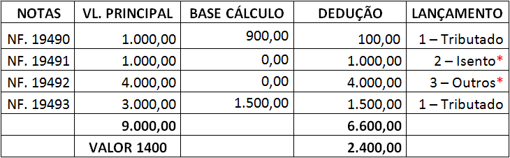 * Na Dedução das operações com lançamentos 2 - Isentos e 3 - Outros, é atribuído zero para a Base de Cálculo. Portanto, é deduzido o total do Valor Principal.