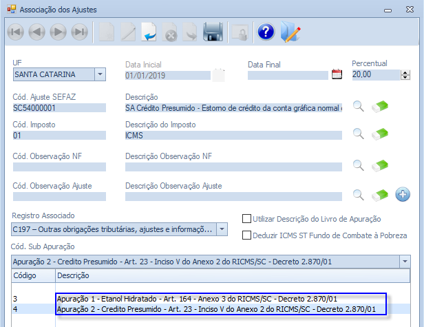 Exemplo: Sub-apuração 2 – Crédito Presumido: Art. 23, Inciso V do Anexo 2 do RICMS/SC, aprovado pelo Decreto 2.870/2001.