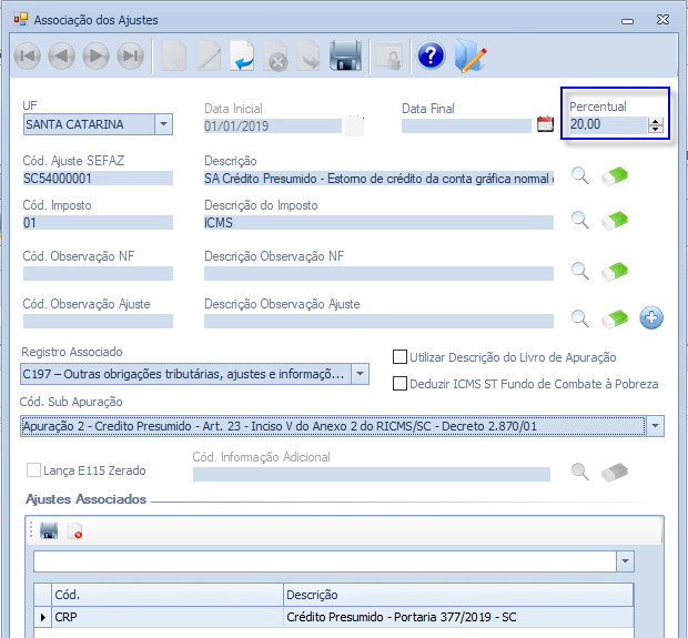 Tratados os campos 02 (VL_TOT_TRANSF_DEBITOS_OA), 05 (VL_TOT_TRANSF_CREDITOS_OA), 10 (VL_TOT_DED) e 13 (DEB_ESP_OA) do registro 1920 para que seja aplicado o percentual informado na tela "Associação dos Ajustes".