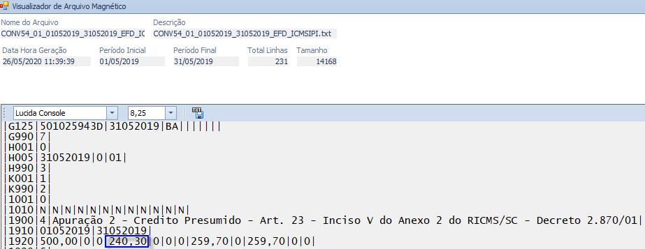 Descrição da Nota: Alteração nos registros 1900 e 1920 para atender à Portaria 377/2019 - SC. Tratados alguns campos dos registros 1960, 1970, 1975 e 1980 para considerar o Vl. Contábil ao invés do Vl. Bruto do Item. Tratado o registro 1400 para considerar apenas as operações tributadas ao calcular da diferença entre o Vl. Total e a Base de Cálculo de algumas situações. Tratado o registro C185 para selecionar as Notas Fiscais de Saída identificadas no Relatório das Informações Complementares do ICMS ST.