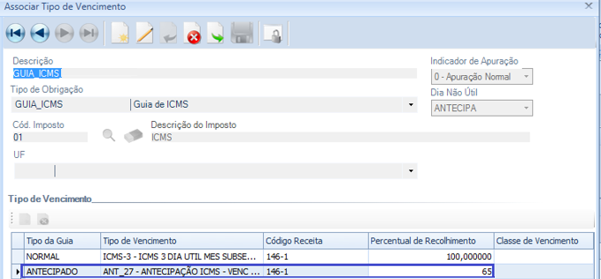 Portanto, deverá ser configurada uma única GUIA_ICMS, com dois Tipos de Guia, "Normal e Antecipado".