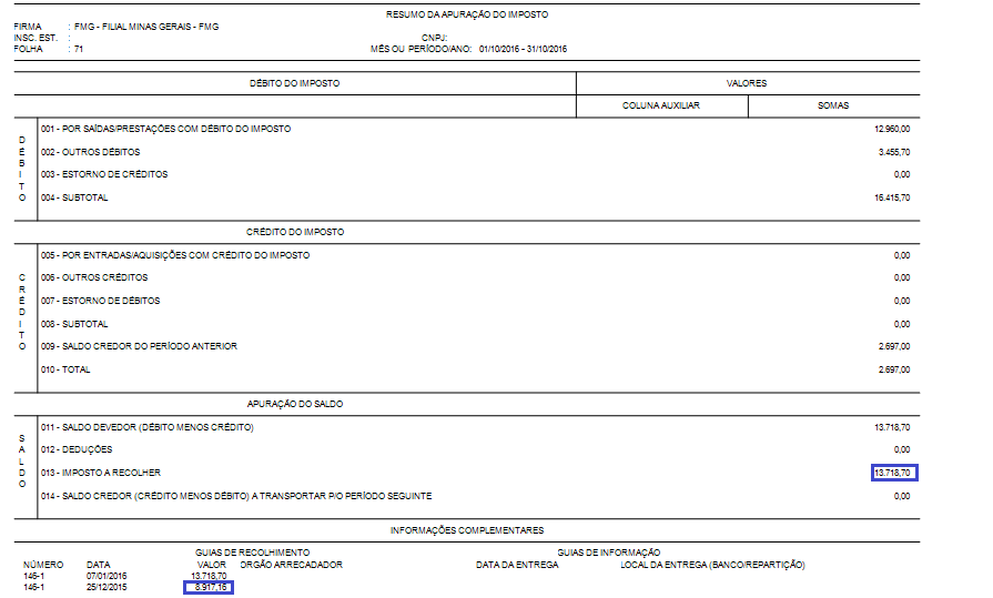Exemplo: ICMS-ANTECIPADO (65%) - Ref. ao Mês 10/2016
