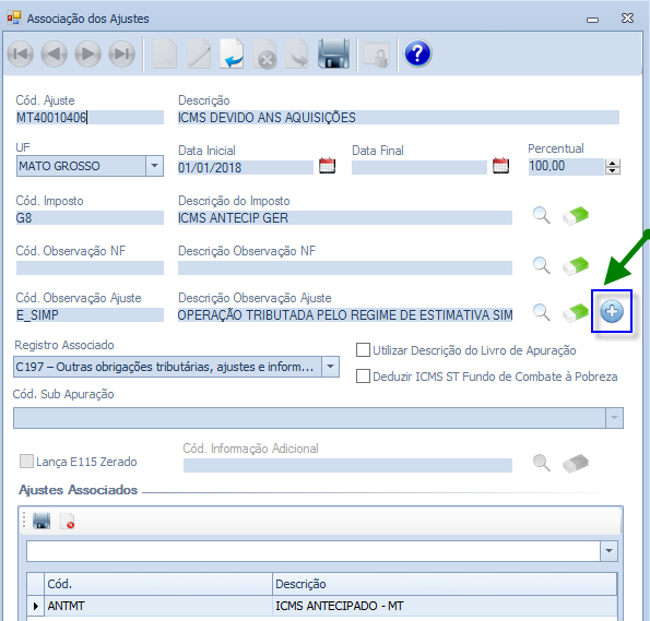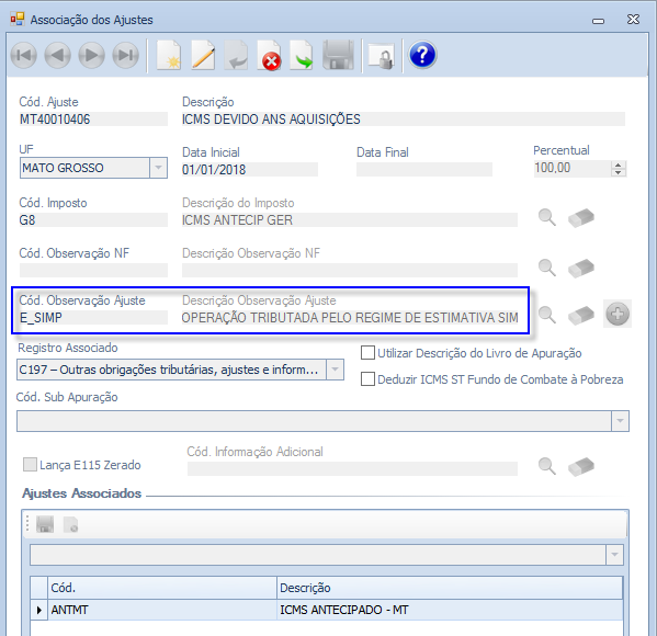 Em atendimento ao Decreto 1599/2018 - MT, foi disponibilizado o campo "Cód. Observação Ajuste" na tela "Associação dos Ajustes", conforme ilustrado abaixo: