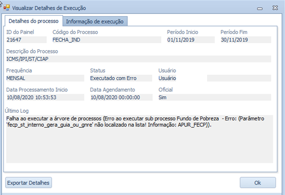 Erro no encerramento de indiretos, ocasionado pelo parâmetro 'fecp_st_interno_gera_guia_ou_gnre'.