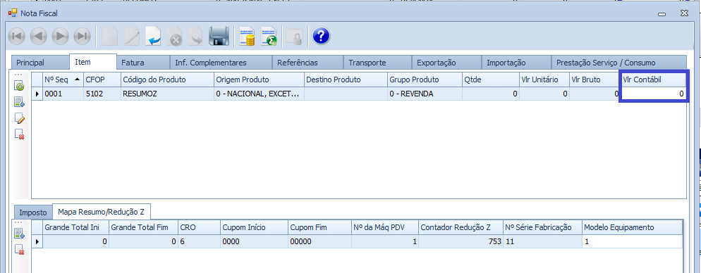 Como a Observação é diferente de 022 e 032 e a Série diferente de ECF, CMR e SAT, o campo Total da Nota Fiscal é obrigatório e deve ser maior que 0.