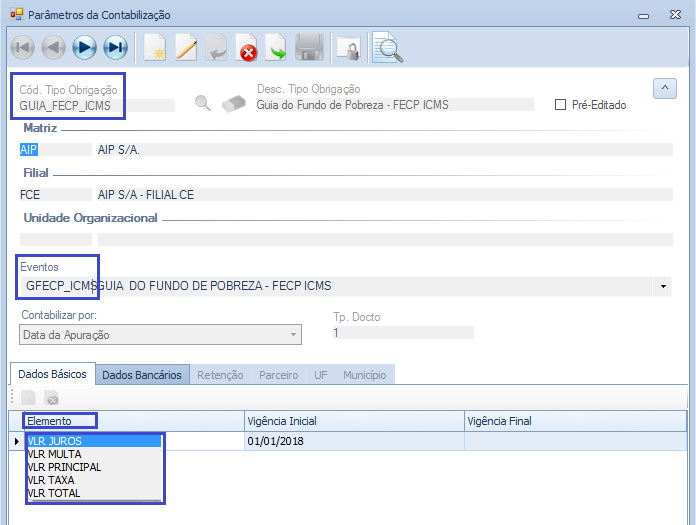 Exemplo - Cadastro de contabilização GUIA_FECP_ICMS: