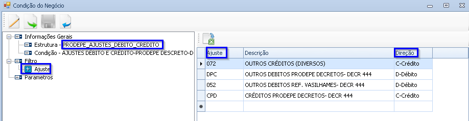 Criar uma condição de negócio para cadastro dos ajustes de cada decreto. Os códigos de ajustes de cada decreto deverão ser distintos.