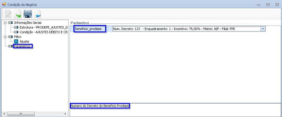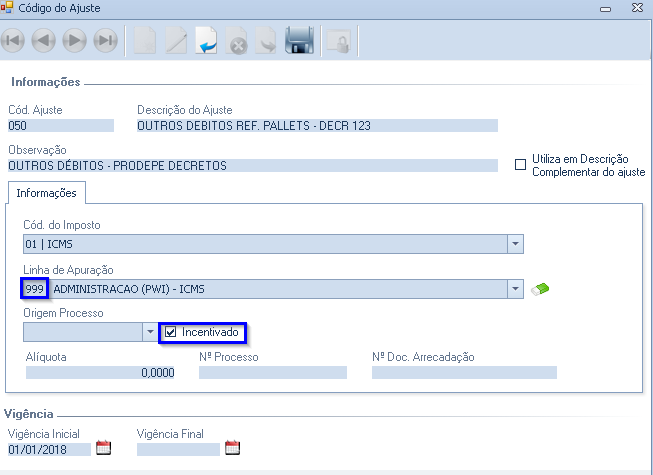 Incentivado: Marcar esta opção, para que o ajuste seja considerado somente na apuração de cada decreto. Se não houver flag nessa opção, o ajuste será considerado também na apuração consolidada.