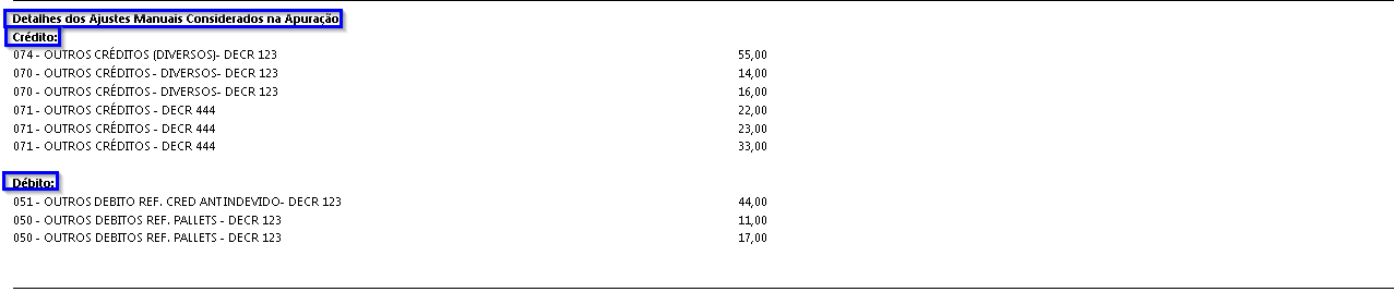 No final da página será apresentada uma lista com os ajustes manuais de débito e crédito do período: