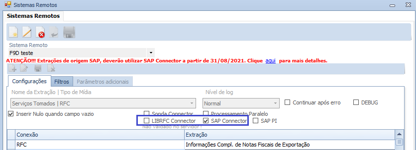 Ao editar o sistema remoto alterando o tipo de conexão de LIBRFC Connector para Sap Connector, ocorria a seguinte mensagem: