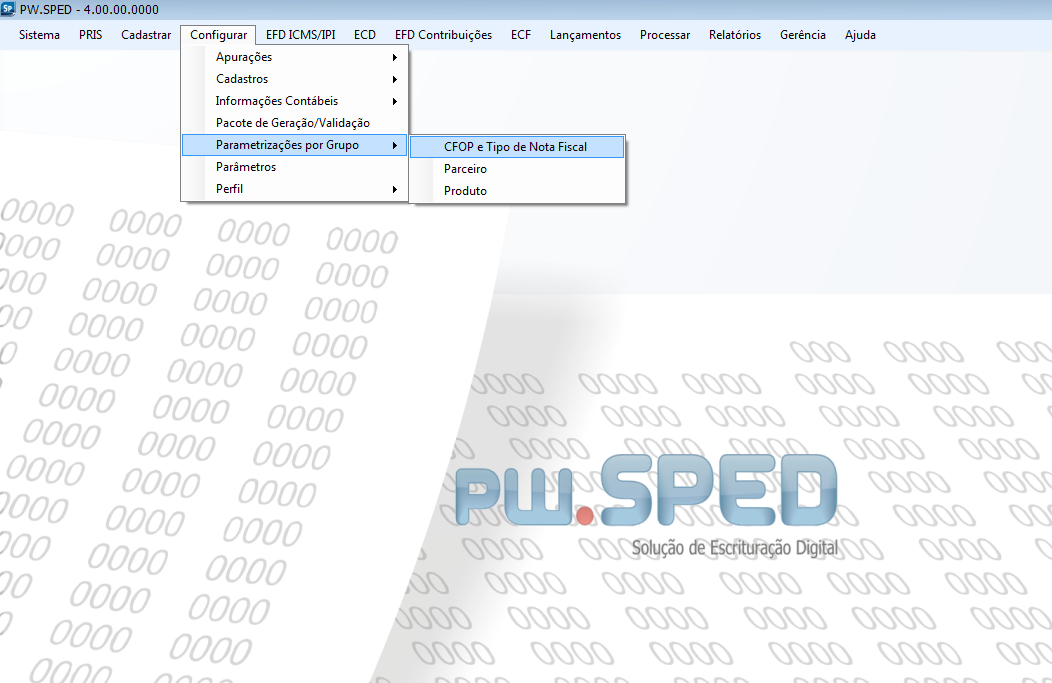Para acessar a funcionalidade, selecione a opção Configurar > Parametrização por Grupo > CFOP e Tipo de Nota Fiscal.