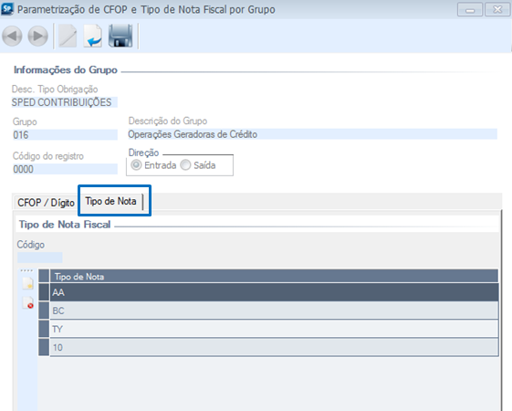Os grupos 016, 017, 018, 020, 021, 022 e 023 serão os únicos grupos que terá a aba Tipo de Nota (ver imagem abaixo).