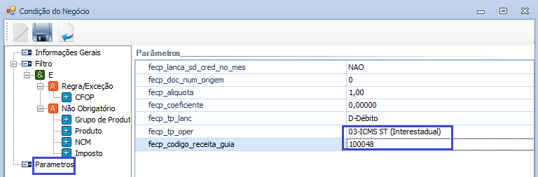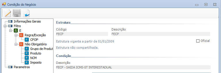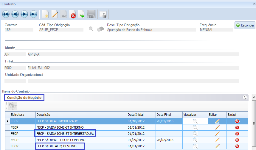 Deverá existir apenas uma Condição de Negócio de FECP s/ ST Interestadual e uma Condição de Negócio de FECP s/ Dif. Aliq. Destino atrelada ao contrato APUR_FECP.