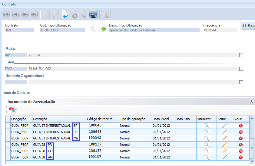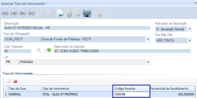 Deverá ser cadastrado um documento de arrecadação para cada UF com movimento. Porém, o código de receita de todas a guias deverá ser o mesmo informado na condição de negócio.
