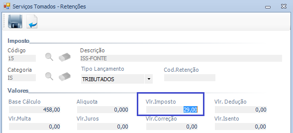 Na tela de Serviços Tomados aba Retenções, o campo Vlr. Imposto não permitia alteração na edição do lançamento.
