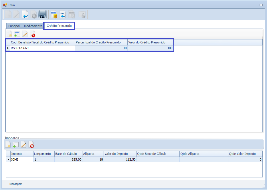 A seguir apresentam-se os campos na aba Crédito Presumido, presente na tela “Item” (Nota Fiscal):