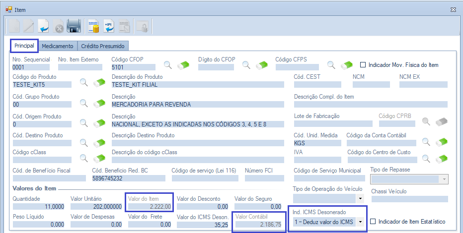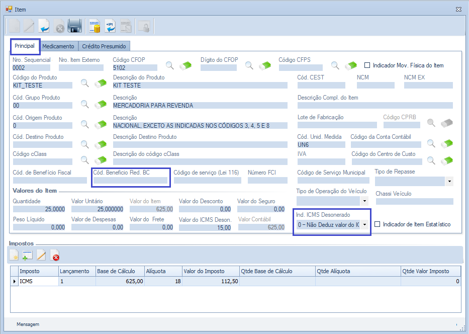 A seguir apresentam-se os campos na aba Principal, presente na tela “Item” (Nota Fiscal):