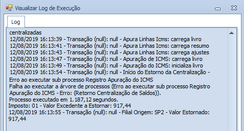 Falha ao executar a árvore de processos (Erro ao executar sub processo Registro Apuração do ICMS - Erro: (Retorno Centralização de Saldos)).