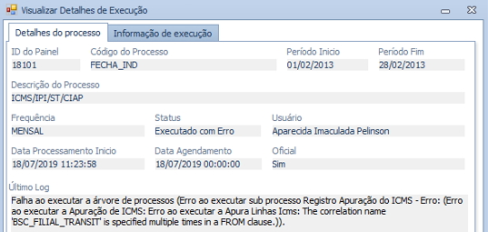 “Falha ao executar a árvore de processos (Erro ao executar sub processo Registro Apuração do ICMS - Erro: (Erro ao executar a Apuração de ICMS: Erro ao executar a Apura Linhas Icms: The correlation name 'BSC_FILIAL_TRANSIT' is specified multiple times in a FROM clause.))”.