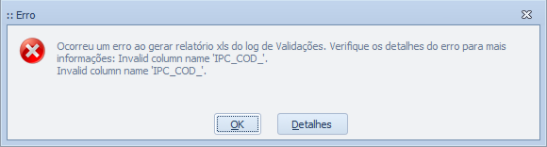 Detalhes do erro (Parte): Mensagem: Invalid column name 'IPC_COD_'. Invalid column name 'IPC_COD_'. - StackTrace: Server stack trace: at System.ServiceModel.Channels.ServiceChannel.ThrowIfFaultUnderstood(Message reply, MessageFault fault, String action, MessageVersion version, FaultConverter faultConverter)