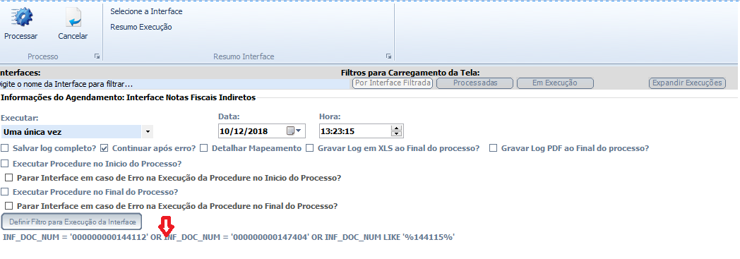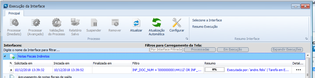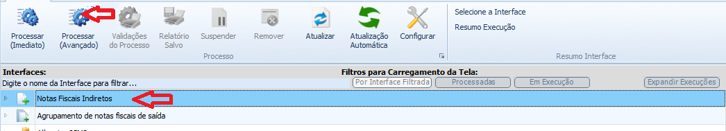 Na de Execução de Interfaces, clicando sobre a interface e no botão “Processar (Avançado).